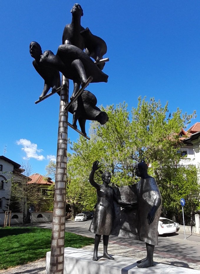 Reamintesc Fântâna și Maternitatea "anglicană", care pune un delicat, triumfant și venerabil Bine să călărească un cățel reptilian (ce latră mai degrabă pentru a face loc avansului Femeii), deoarece aceeași temă a dualităților și duplicităților radicale e variată spectaculos și în Triumful din scuarul cartierului Cotroceni, unde cei doi anticomuniști sunt monumentali prin postură, veșmânt eroic, atitudine, în vreme ce harpiile diforme ale securiștilor sunt prădătoare minuscule, de alungat c-un singur cuvânt și gest ferm. E tot ideea vremelniciei răului și-a victoriei pozitive, acolo ceva mai explicită (istoric), descriptivă. În vreme ce la Fântâna Maternității, cu-a sa originală versiune de (mini)Sfânt Gheorghe (+minipotrivnic cărător), ca și aici la Porumbelul șezând/clocind pe-un creștet blând, ideea face apel la universalități mito-simbolice relevante și echilibrări energetice valide și pentru psiheiele și psihismele omenești.