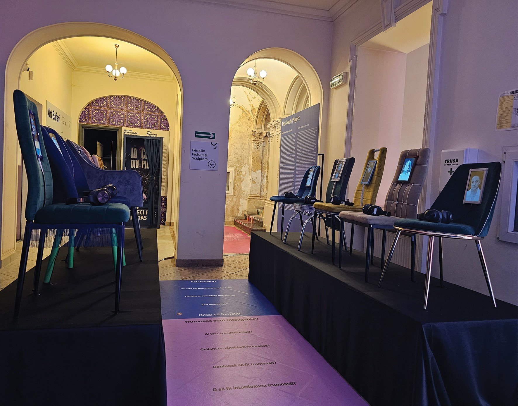 Al doilea aspect conceptual al proiectului a fost o explorare a absurdului. Fiecare femeie este asociată cu un model diferit de scaun, în spătarul cărora au fost integrate ecranele tabletelor, cu interviul filmat prim-plan (avem niște capete vorbitoare de femei frumoase) și o imagine alb-negru. Spectatorul, într-o formulă ironică, văzut din exterior, va părea că stă să privească spătarul unui scaun gol.