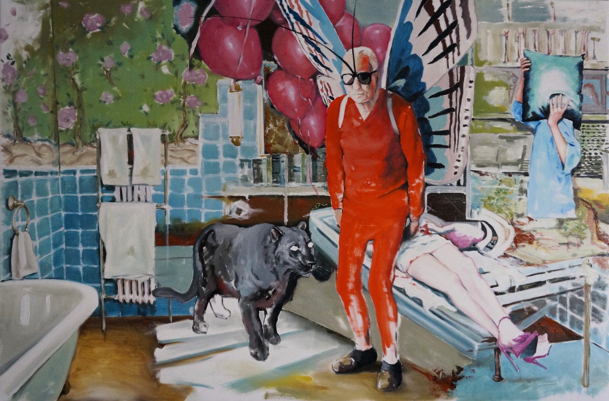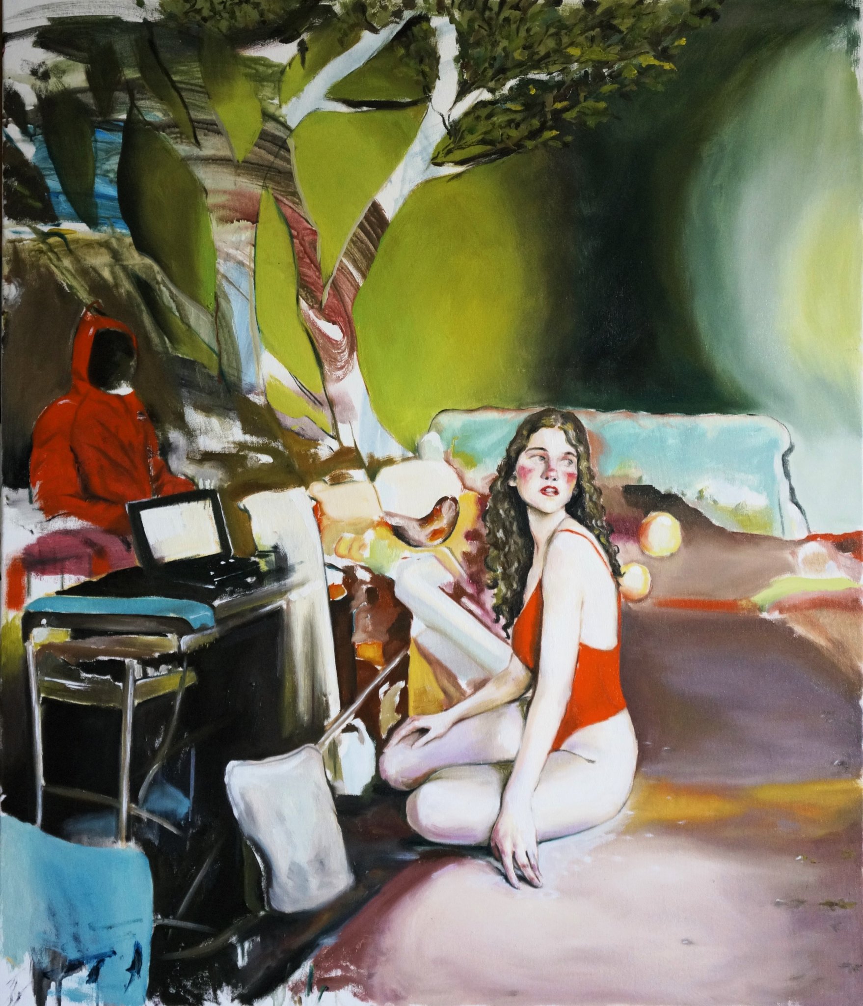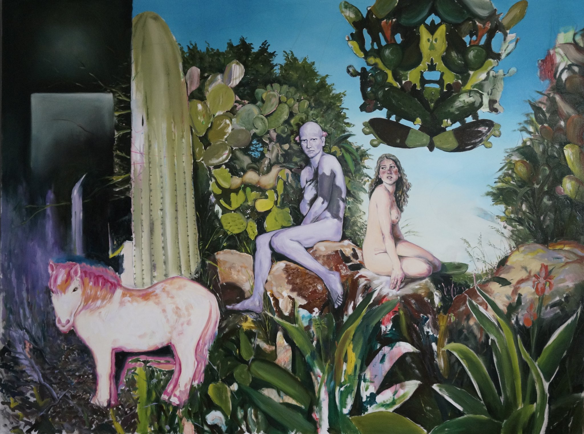 Lucrările din această serie se situează deliberat într-o zonă de frontieră între real și imaginar, între figurativ și simbolic. În compozițiile mele, spațiul pictural devine un loc al tensiunii vizuale: corpurile și elementele naturale coexistă într-un echilibru fragil, aproape teatral, unde totul pare familiar, dar nimic nu este complet recognoscibil. Fragmentarea planului, suprapunerile neașteptate și raporturile disproporționate dintre personaje și peisaj creează o instabilitate perceptivă, o ruptură intenționată în coerența imaginii. Această disonanță invită privitorul să își reconfigureze constant poziția în fața tabloului, oscilând între contemplare și neliniște.
