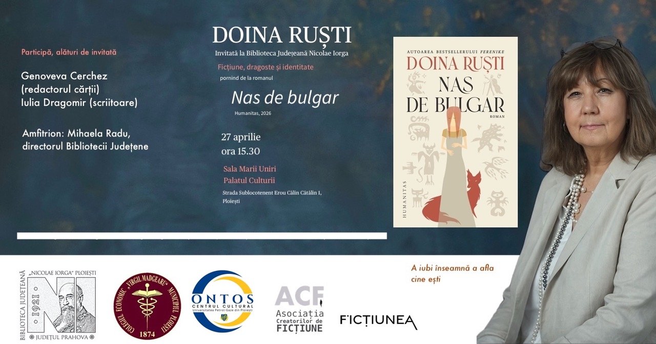 Întâlnirea de la bibliotecă se va derula în formula unei discuții despre ficțiune, dragoste și identitate și va porni de la recentul roman Nas de bulgar (Humanitas, 2026). Participă Doina Ruști, Genoveva Cerchez (din partea editurii Humanitas), Iulia Dragomir (scriitoare) și Mihaela Radu, directoarea bibliotecii.
